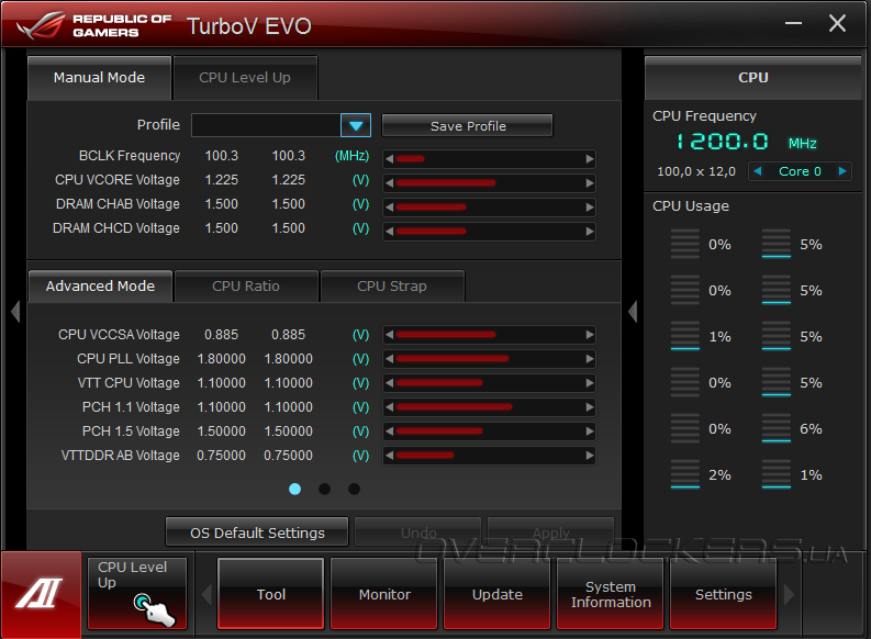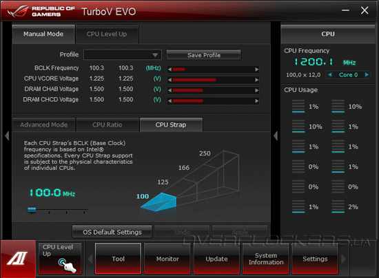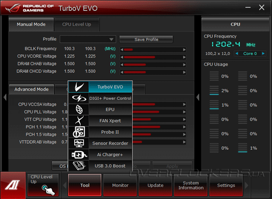 Автоматический и ручной оверклокинг, не покидая окружения операционной системы, можно осуществлять в разделе TurboV EVO. По сути, эта утилита копирует большую часть настроек вкладки Extreme Tweaker из UEFI платы. Отметим, что опции автозагрузки профиля разгона при входе в операционную систему не предусмотрено, однако при осуществлении оверклокинга в интерфейсе TurboV EVO все энергосберегающие функции сохраняют работоспособность.