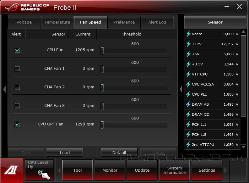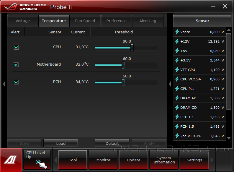 Утилита Probe II предназначена для программного мониторинга напряжений питания на основных узлах платы, скорости вращения подключенных вентиляторов и температур CPU и чипсета.