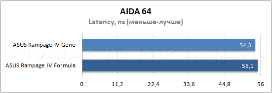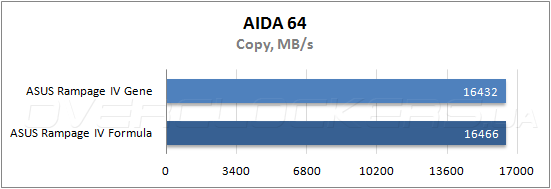 В бенчмарке памяти AIDA 64 в трёх тестах из четырех компактная плата оказалась немного быстрее ASUS X79 Rampage IV Formula. Лишь в тесте копирования полноформатное решение взяло небольшое реванш.