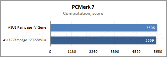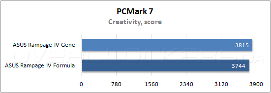 В популярном приложении для оценки производительности системы — PCMark 7 — ASUS Rampage IV Gene продемонстрировала ощутимо более высокие результаты в сравнении с ASUS X79 Rampage IV Formula во всех пяти тестах. Вероятно, такую разницу между соперниками можно объяснить лишь лучшей оптимизацией прошивки компактной платы.