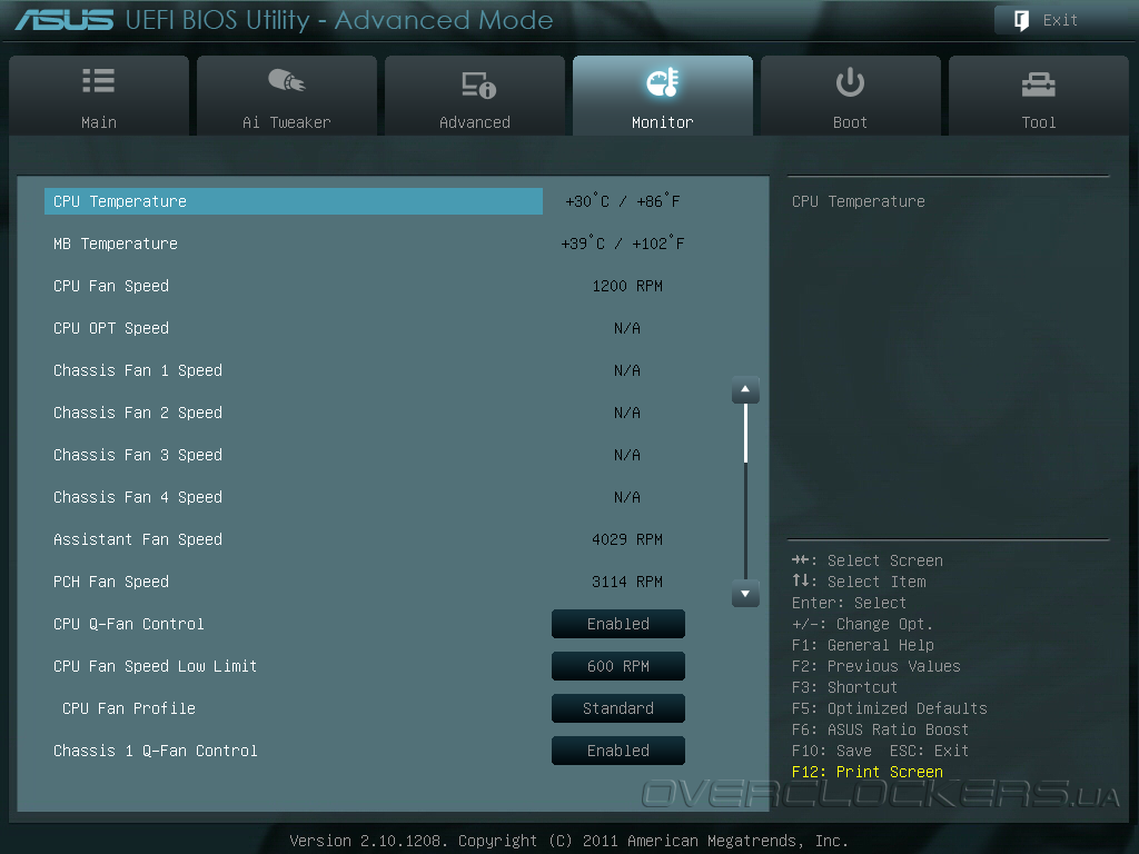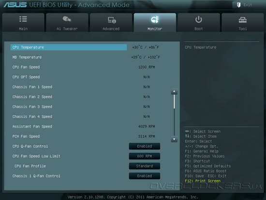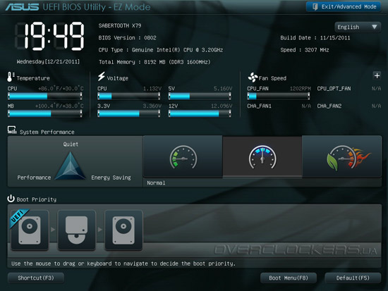 По нажатию клавиши «Del» на клавиатуре во время загрузки компьютера пользователь попадает в оболочку UEFI EZ-Mode. Здесь можно установить последовательность устройств, с которых будет загружаться ОС, выбрать режим работы подключённых к системной плате вентиляторов, быстро настроить энергосберегающие технологии, а также отслеживать показания мониторинга основных напряжений и температур. Разумеется, оверклокерам и просто любителям тонкого тюнинга системы необходимо сразу переходить в режим Advanced Mode.