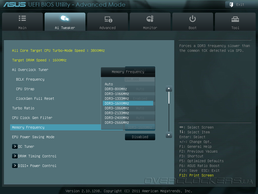 - выбрать частоту работы оперативной памяти (1066/1333/1600/1866/2133/2400/2666 МГц);