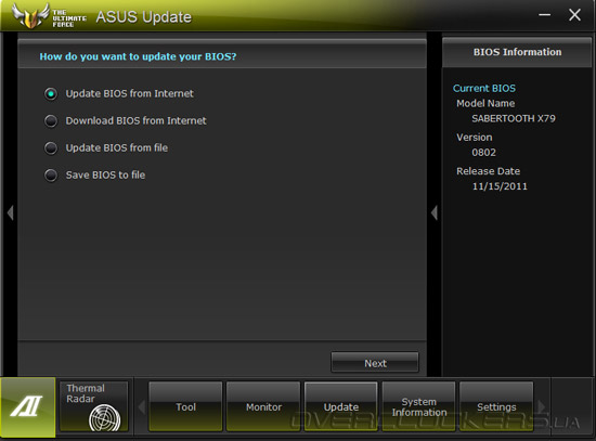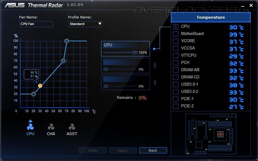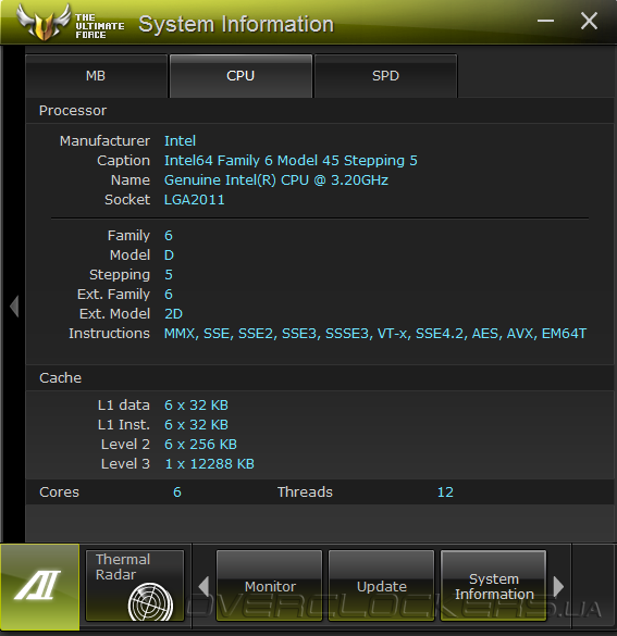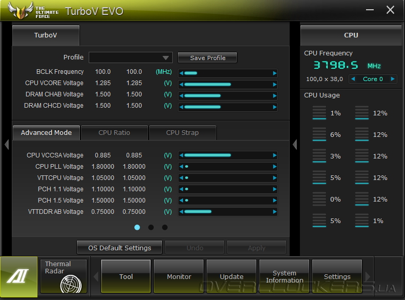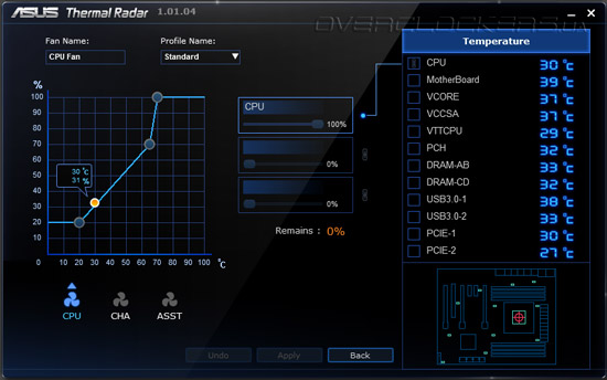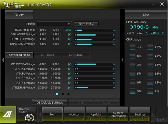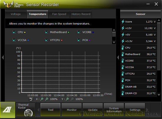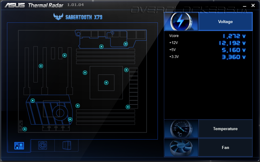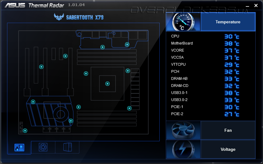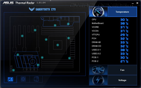 С её помощью можно отслеживать показания 12 термодатчиков, установленных по всей площади ASUS Sabertooth X79. Кроме этого, программа Thermal Radar отображает значения основных напряжений в режиме реального времени, а также позволяет управлять скоростью вращения подключенных к плате вентиляторов.