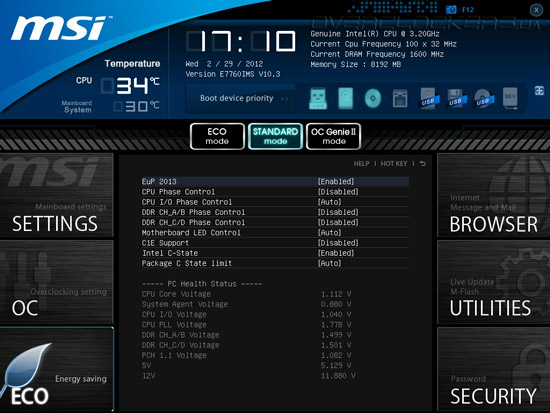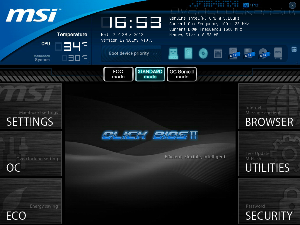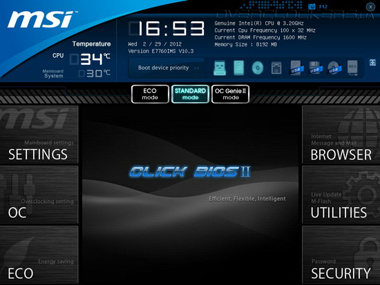 Так же, как и большая часть современных материнских плат, MSI X79A-GD45 (8D) оснащена прошивкой с поддержкой Unified EFI, приятным графическим интерфейсом Click BIOS II и возможностью управления с помощью мыши.