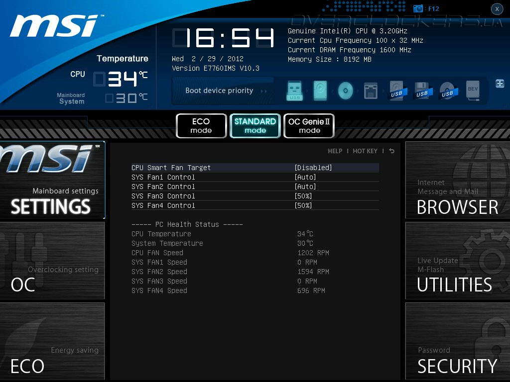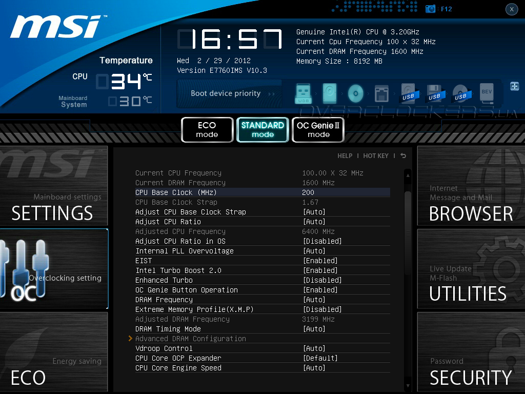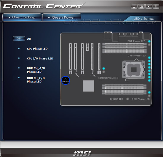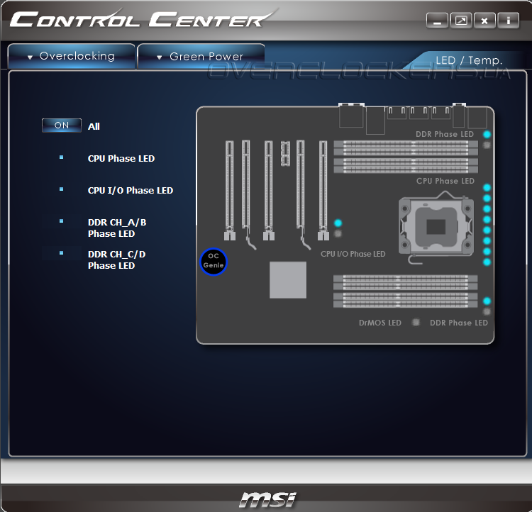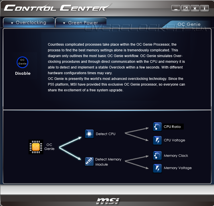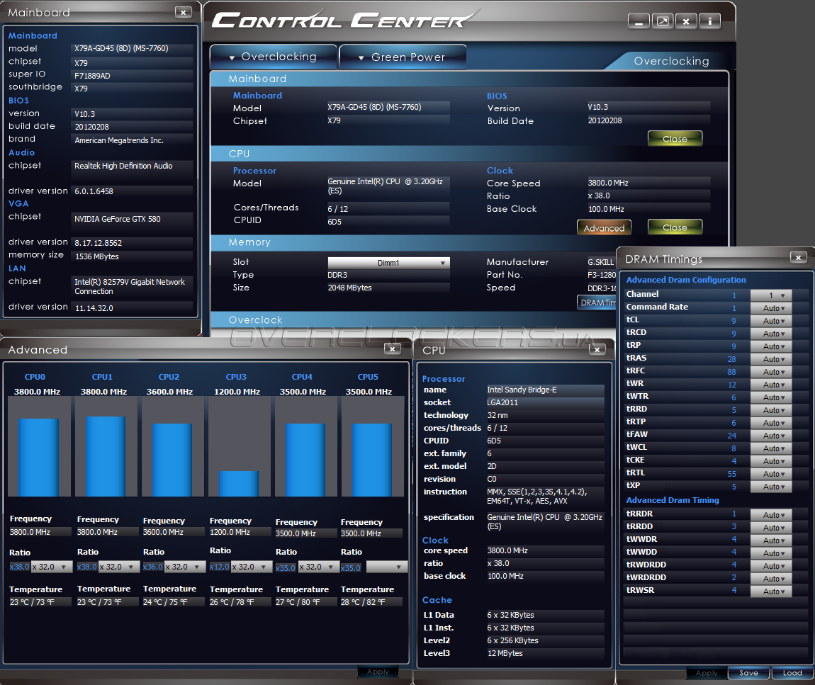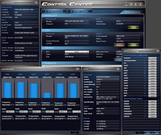 Первая программа называется Control Center и с её помощью пользователи могут не только получить подробную информацию о системе, осуществлять мониторинг температур центрального процессора и чипсета, а также управлять подключенными к плате вентиляторами, но и производить разгон процессора и модулей RAM, не покидая операционной системы. В разделе Overclocking также можно настроить режим работы технологии Turbo Boost, активировать функцию автоматического разгона OC Genie II и оптимизировать тайминги ОЗУ.