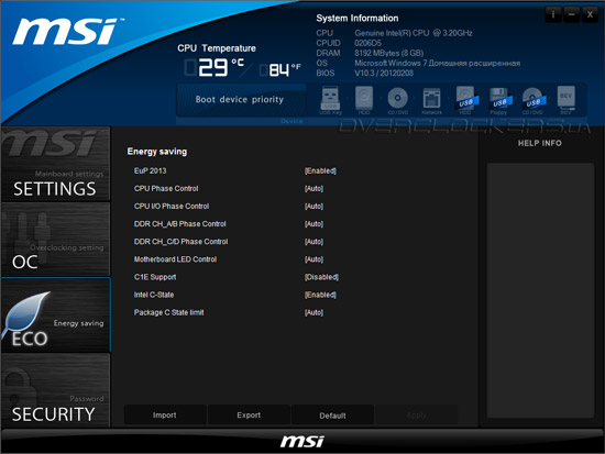 Следующий раздел UEFI носит название Energy Saving и, как можно догадаться из названия, здесь собраны настройки энергосберегающих технологий, а также «продвинутого» управления другими функциями, касающимися питания. Помимо этого, здесь приводятся данные программного мониторинга основных системных напряжений.