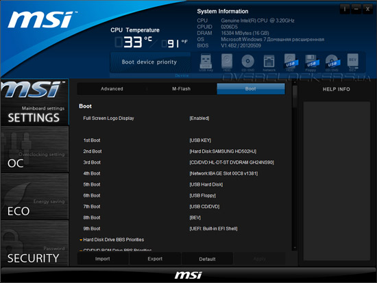 У микрокода есть даже свое название — Click BIOS II, знакомое по последним продуктам MSI. При входе в прошивку пользователь попадает в главный раздел, где отображается время, дата, температура двух датчиков и краткая информация о системе. Там же можно выбрать порядок загрузки с определенного устройства, меняя местами соответствующие иконки. Остальные настройки сосредоточены в разделах Settings, OC, ECO, Browser, Utilities и Security.