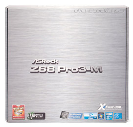 Материнская плата ASRock Z68 Pro3-M поставляется в небольшой коробке без ручки для переноски. Её оформление, традиционно для ASRock, лаконичное, но приятное. На лицевой стороне упаковки производитель разместил логотипы поддерживаемых платой технологий и процессоров, а также чипсета Intel Z68 Express, который лег в основу продукта. Яркая наклейка в левом нижнем углу информирует пользователя о том, что в комплект поставки входит пробная версия программы Media Espresso 6.5.