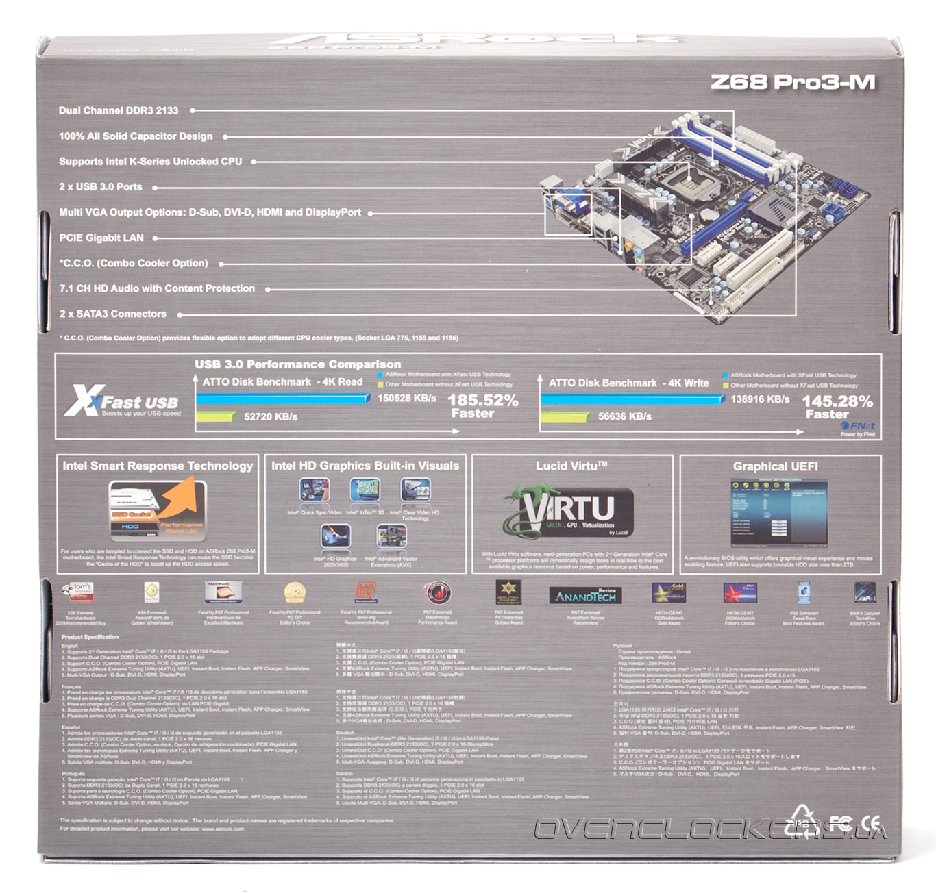 На обратной стороне указаны ключевые особенности платы и краткие технические характеристики, расписанные на 11 языках, включая русский.