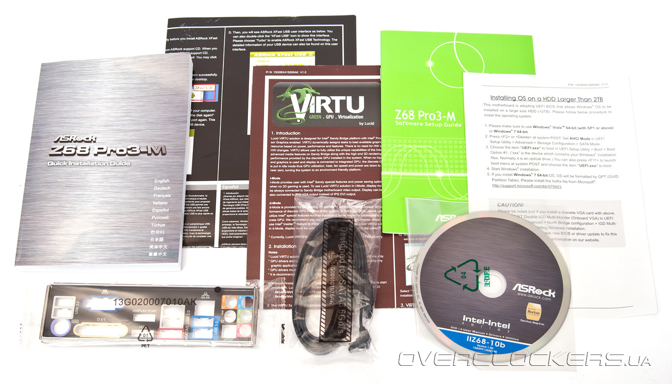 Комплект поставки довольно скромный и в точности повторяет таковой для полноформатной ASRock Z68 Pro3: