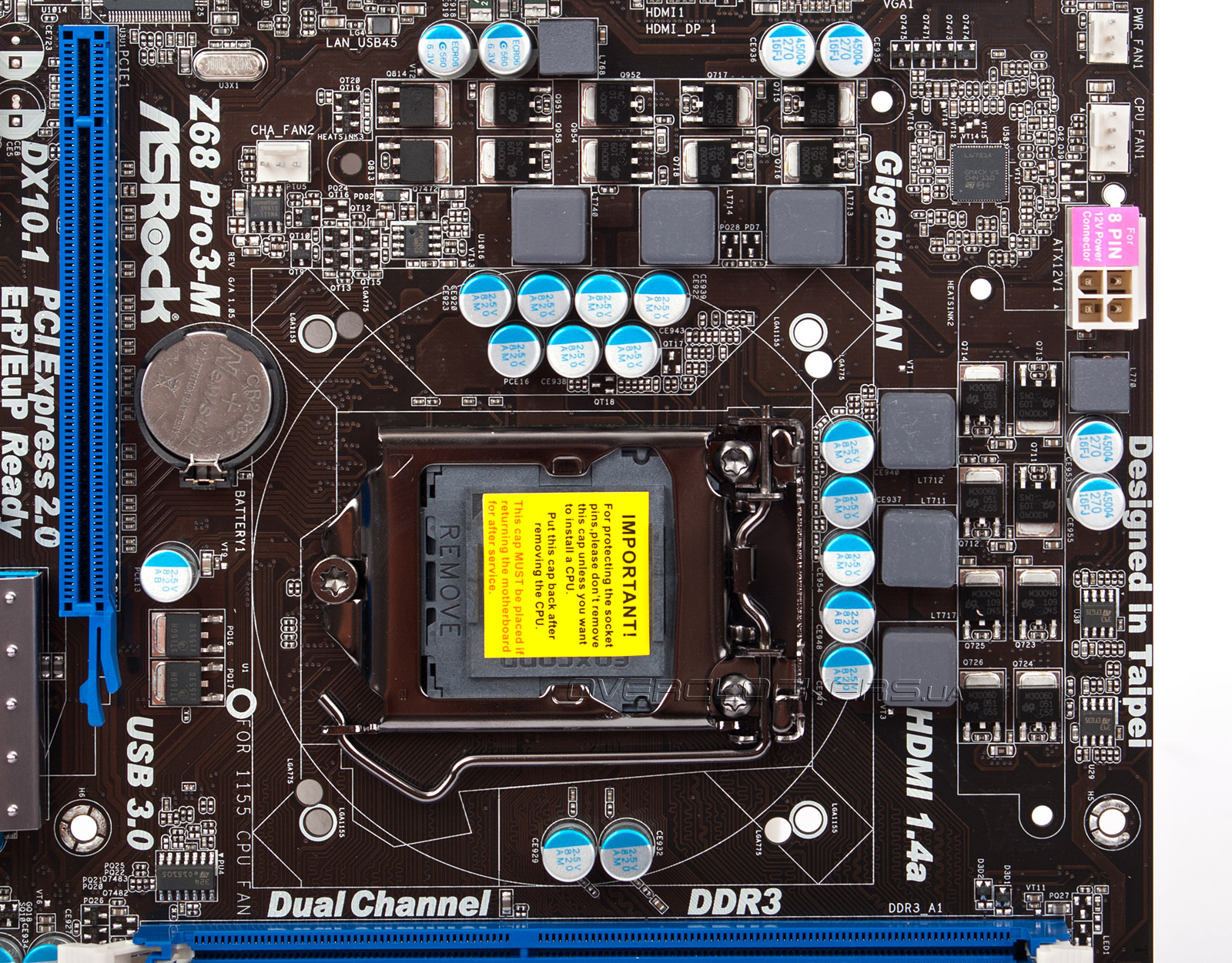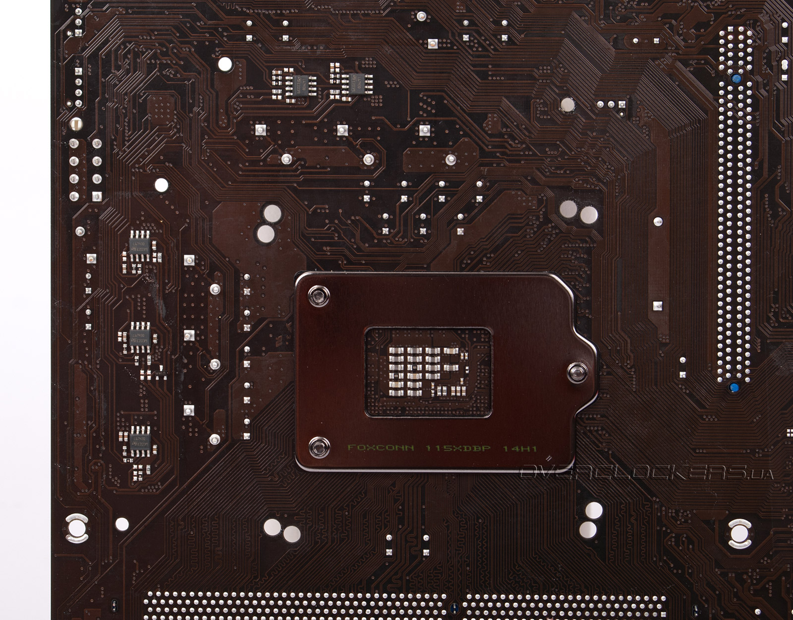 С обратной стороны платы распаяна часть элементов модуля VRM. Процессорный разъем изготовлен подрядчиком Foxconn.
