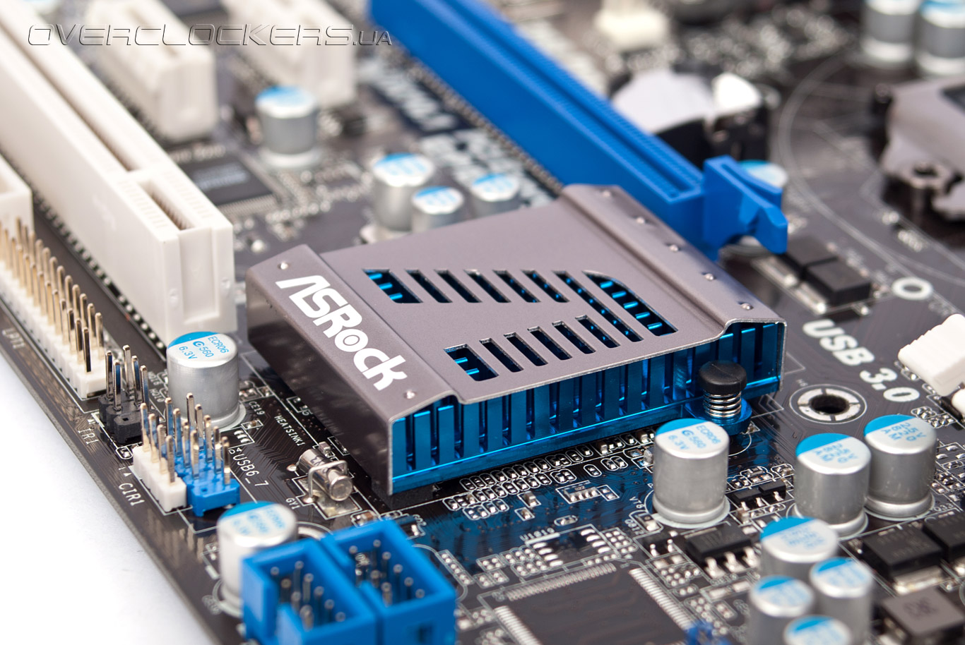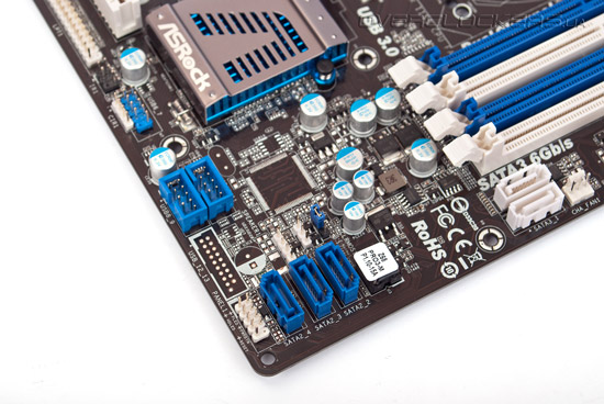 В правой нижней части текстолита расположены внутренние разъемы USB 2.0, микросхема с UEFI, а также порты SATA второй и третьей ревизии, за поддержку которых отвечает чипсет Intel Z68 Express. Он распаян немного ближе к слотам расширения. При первом взгляде на плату невольно возникает вопрос, почему портов SATA 3 Гбит/с только три, ведь применяемый южный мост поддерживает четыре таких интерфейса. Ответ оказался вполне очевидным — один из них вынесен на заднюю панель ввода/вывода в виде разъема eSATA.