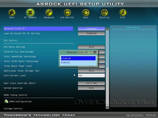 Функция автоматического разгона носит название Advanced Turbo 50, и, по словам производителя, позволяет лишь в одно действие ускорить CPU, RAM и встроенное в процессор графическое ядро, получив, таким образом, прирост производительности, который в некоторых приложениях доходит до 50%.