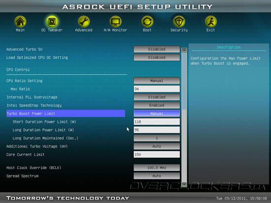 Стоит также отметить широкие энергосберегающие возможности платы. Опытный пользователь, стремящийся получить не только производительную, но и энергоэффективную систему, может ограничить максимальное повышение напряжения подаваемого на CPU в процессе работы технологии Intel Turbo Boost 2.0, установить лимит на потребляемую процессором мощность в различных режимах работы.