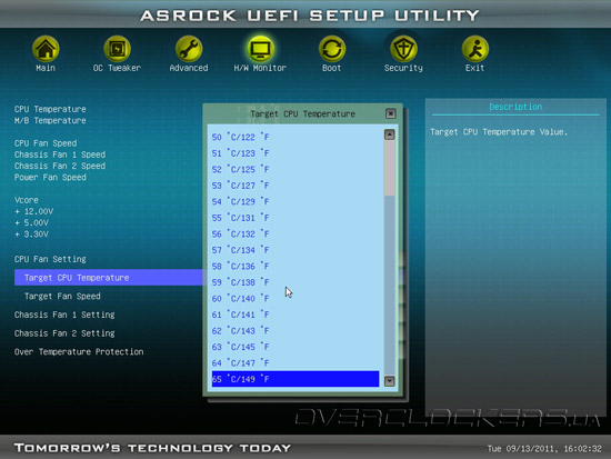 Во вкладке H/W Monitor пользователь может следить за показаниями термодатчиков на процессоре и чипсете, напряжением на линиях питания 3,3, 5 и 12 В, а так же управлять скоростью вращения подключенных к материнской плате вентиляторов. Причем для достижения оптимального соотношения между шумом и эффективностью охлаждения, материнская плата может регулировать скорость вращения «вертушек» сама, а пользователю будет лишь необходимо задать температуру центрального процессора, которую необходимо поддерживать. Если такой способ управления вентиляторами кому-то покажется недостаточно удобным, он может просто вручную выбрать один из девяти режимов работы.