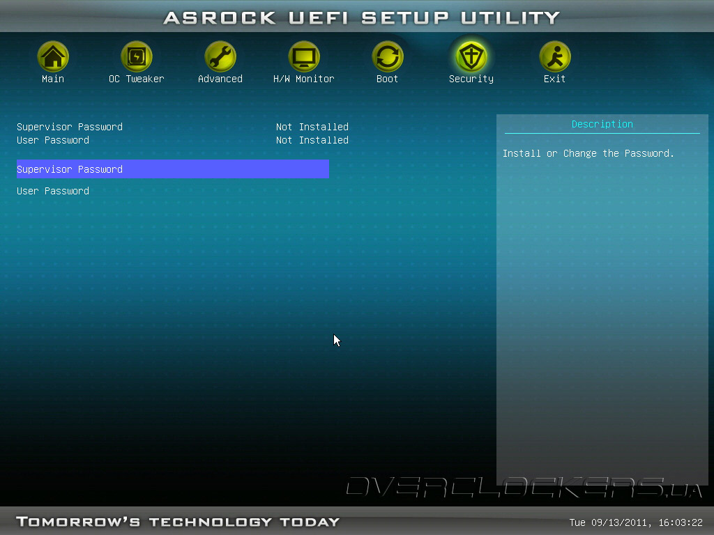 В разделе Security пользователь может установить пароль на включение компьютера.