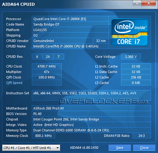 В процессе разгона путем повышения множителя на процессоре без изменения других параметров нам удалось получить полную стабильность четырехъядерного процессора Intel Core i7 2600K нас частоте 4700 МГц.