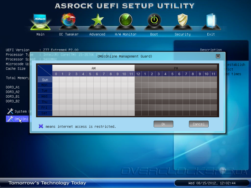 Для настройки платы используется графический интерфейс Unified Extensible Firmware Interface (UEFI), выполненный на микрокоде AMI. При входе в прошивку первым делом пользователь попадает в раздел Main, в котором можно получить краткую информацию о системе, просмотреть все установленные компоненты и режимы их работы, заблокировать доступ к сети согласно расписанию.