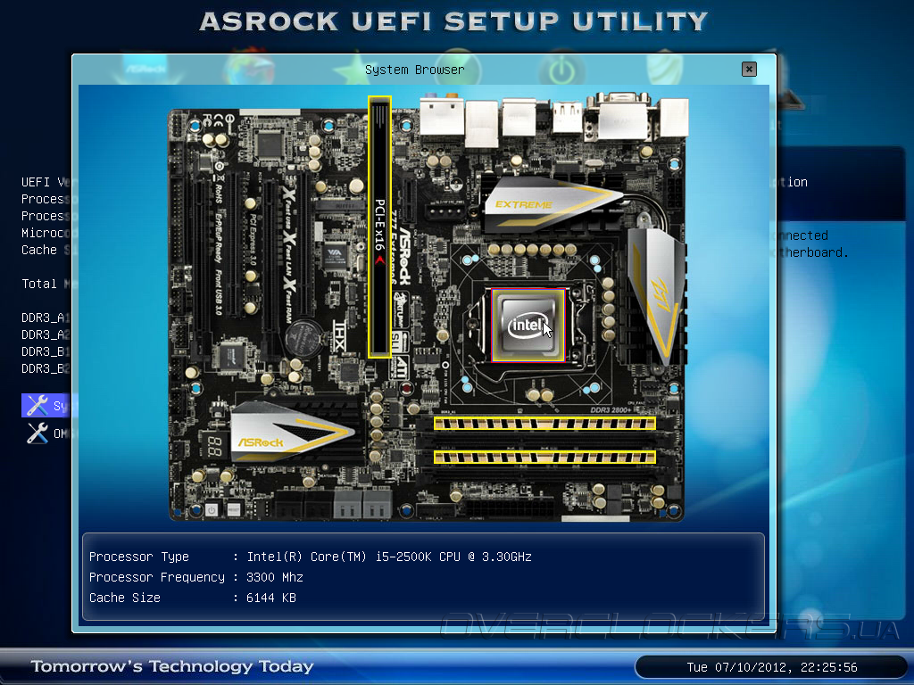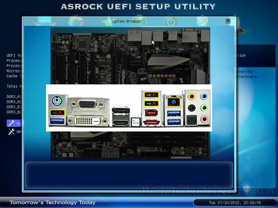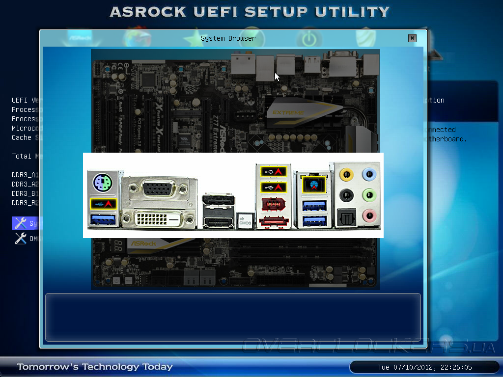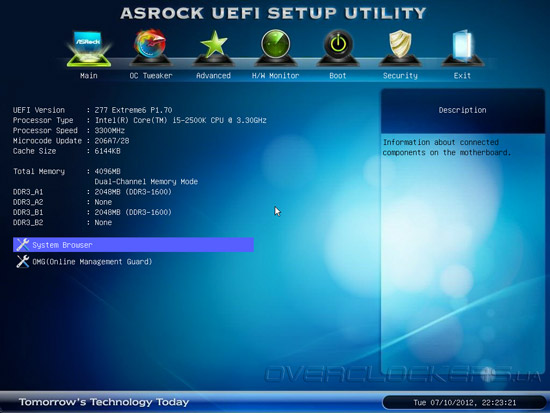 В разделе Main можно увидеть ярлыки для запуска функций System Browser и OMG (Online Management Guard, не путать с восклицанием «Oh My God!»). После запуска System Browser пользователь может получить исчерпывающую информацию о текущих параметрах и аппаратной конфигурации системы. Например, подведя курсор «мыши» к процессорному разъему можно получить данные про установленный CPU.