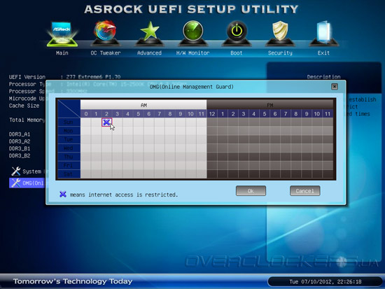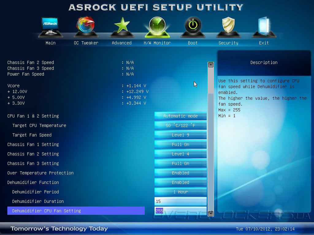 Оригинально выглядит функция Dehumidifier, которая борется с избыточной влажностью внутри системного блока. Принцип её работы предельно прост: в выключенном состоянии или спящем режиме прошивка материнской платы периодически запускает процессорный вентилятор, обеспечивая циркуляцию воздуха в середине корпуса. Пользователь может устанавливать цикличность и длительность работы, а также задавать скорость вращения крыльчатки.