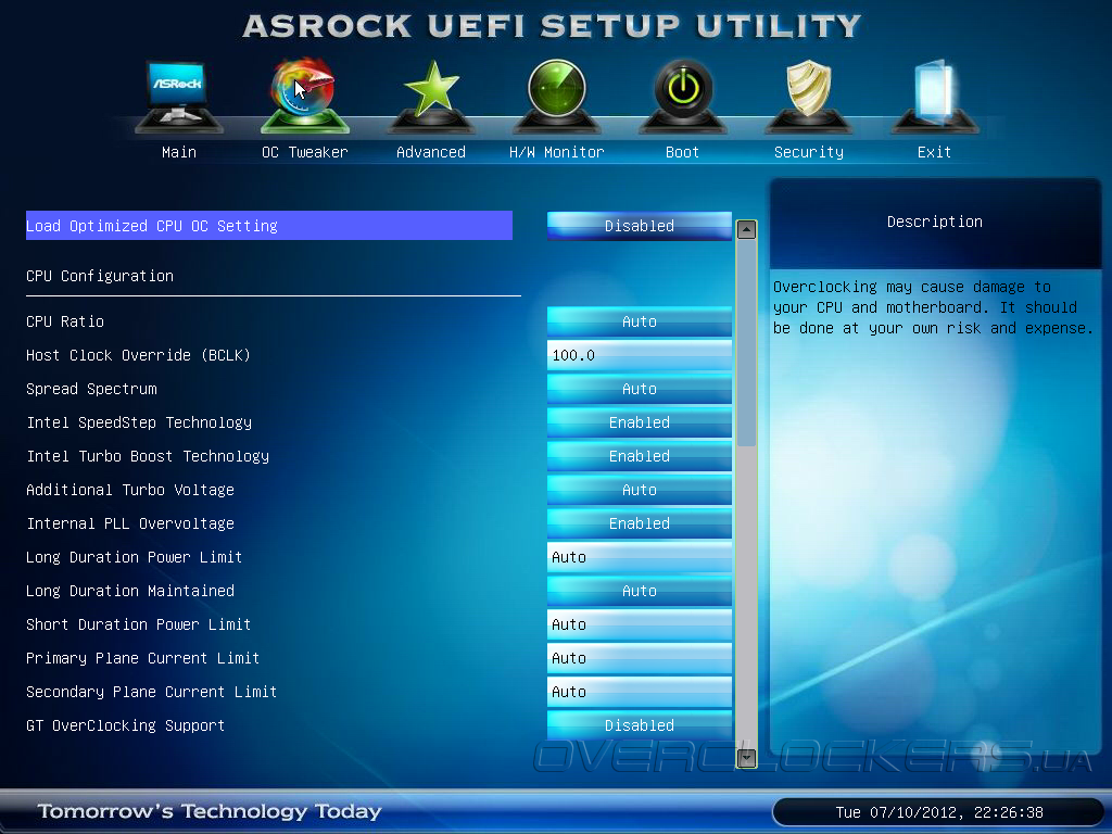 Подавляющее большинство параметров, связанных с управлением быстродействием и разгоном, находятся в разделе OC Tweaker. Кроме настроек базовой частоты и коэффициента умножения вычислительных ядер здесь можно найти управление фирменной технологией Intel Turbo Boost, включить Internal PLL Overvoltage, необходимую для максимального прироста быстродействия, а также активировать разгон встроенного графического акселератора.