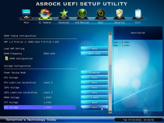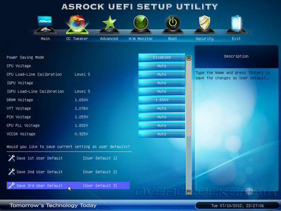 Прошивка ASRock Z77 Extreme6 позволяет управлять семью основными напряжениями на процессоре, модулях ОЗУ и системной логике. Здесь же находится опция Power Saving Mode, которая отвечает за автоматическое переключение количества питающих фаз в зависимости от вычислительной нагрузки. Кроме того, в меню OC Tweaker пользователь может сохранить три профиля настроек.