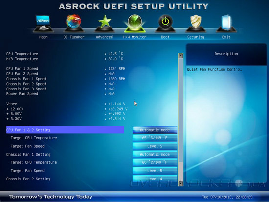 Прошивка материнской платы обладает развитыми возможностями по управлению работой вентиляторов. Для пары процессорных и одного корпусного «карлсона» можно задать автоматический режим в зависимости от температуры вычислительных ядер, а для трех остальных — указать обороты относительно максимальных.
