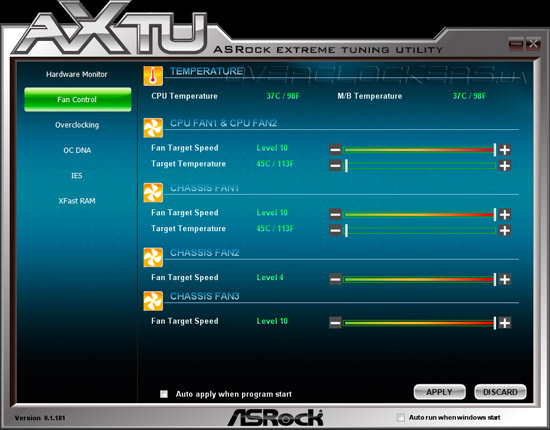 В окне Fan Control находится управление частотой вращения крыльчаток подключенных к системной плате охладителей.