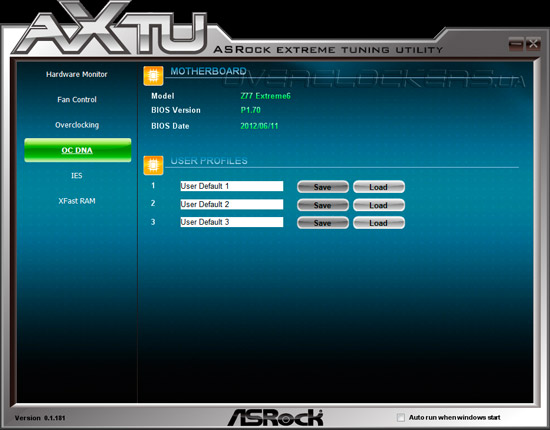Программа AXTU в разделе OC DNA выводит подробную информацию о версии прошивки и позволяет сохранять до трех профилей настроек разгона с возможностью их загрузки.
