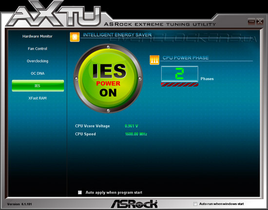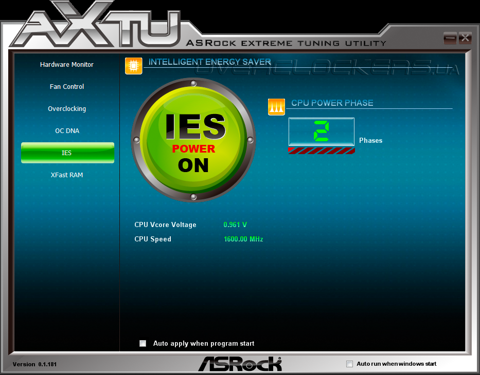 Вкладка IES активирует энергосберегающую функцию Intelligent Energy Saver. Здесь же отображается информация о текущем количестве активных фаз VRM.