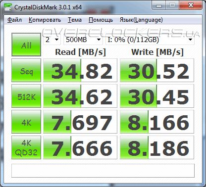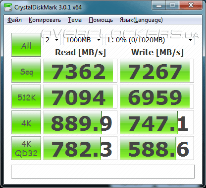 Как известно, при отсутствии питания информация в ОЗУ теряется, на этот случай программа позволяет сохранять содержимое RAM-диска на «винчестер» перед выключением операционной системы, а после включения компьютера данные снова записываются на виртуальный жесткий диск. Эффективность работы RAM-диска мы решили оценить, создав в оперативной памяти раздел размером 1024 МБ. Тестирование в синтетическом бенчмарке CrystalDiskMark 3.0.1 дало следующие результаты.