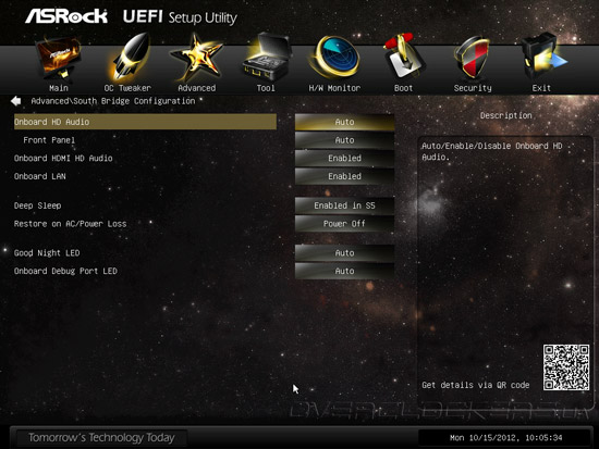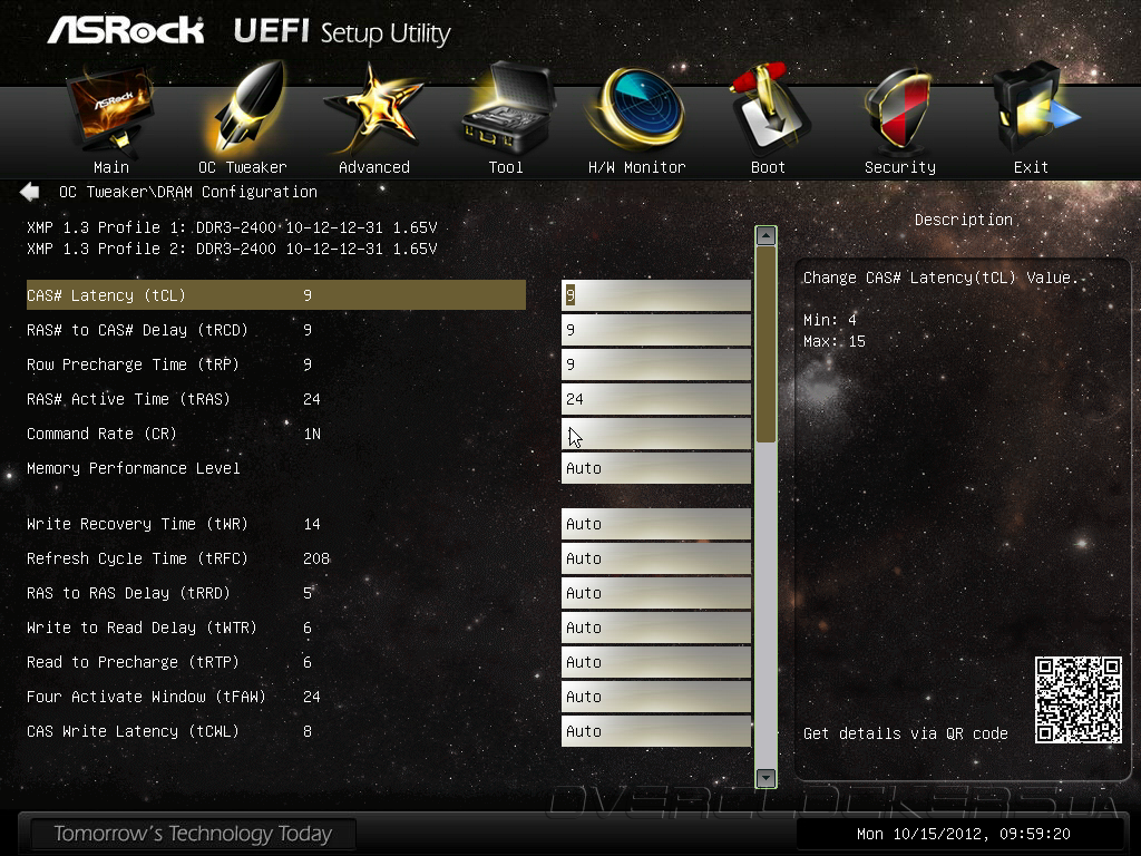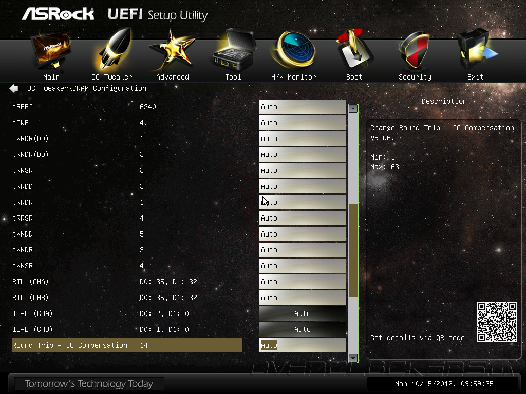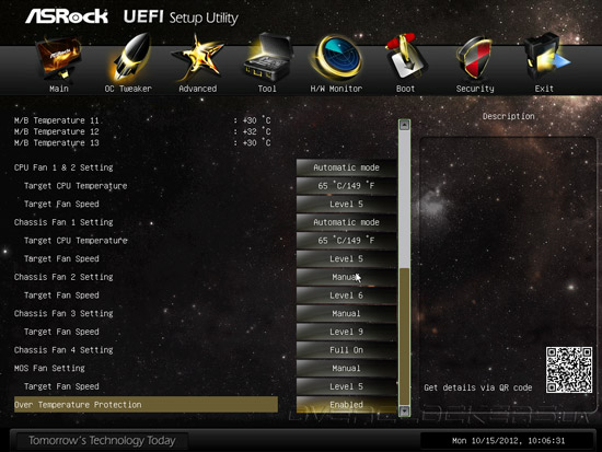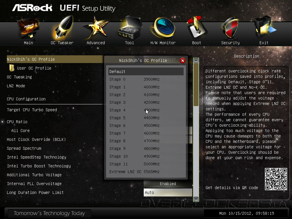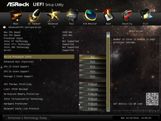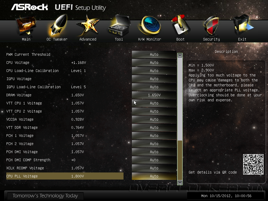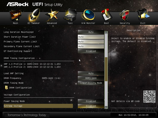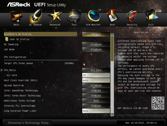 Параметр OC Tweaking, по заявлениям разработчика, способен улучшить результаты в некоторых тестовых приложениях, но мы не заметили особого эффекта от его активации. Обращаем ваше внимание на QR-код, расположенный в правом нижнем углу интерфейса, по которому можно получить ссылку для загрузки инструкции в формате PDF на планшетный ПК или мобильный телефон. Кроме привычных возможностей управления множителем процессорных ядер, частотой тактового генератора, тонких настроек технологии Intel Turbo Boost и функции Internal PLL Overvoltage, прошивка Z77 OC Formula предлагает набор профилей автоматического повышения быстродействия, причем, в их формировании участвовал «гуру» оверклокинга NickShih.