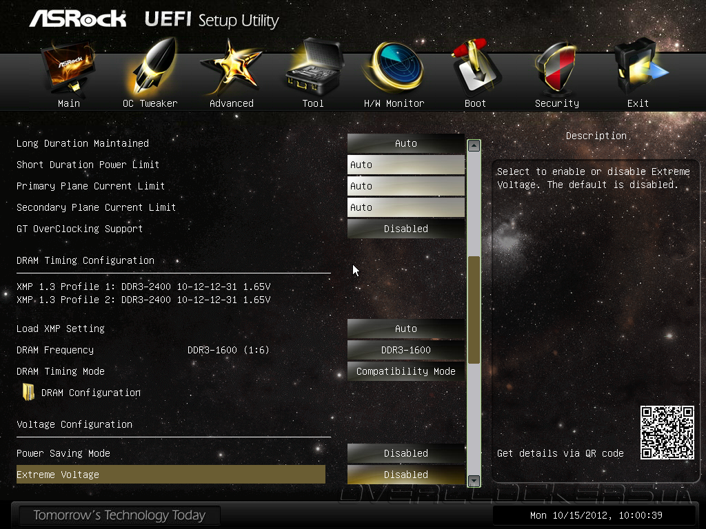 Помимо управления параметрами центрального процессора в раздела OC Tweaker сосредоточены настройки подсистемы оперативной памяти. Прошивка не только умеет работать с профилями X.M.P, но и дает полную свободу по ручной оптимизации быстродействия модулей ОЗУ. Любители разгона оценят опцию DRAM Timing Mode, её установка в значение Compatibility Mode помогает достижению максимальной тактовой частоты, а в Performance Mode можно набрать нескольких дополнительных «попугаев» в синтетических тестах. Обращаем ваше внимание на опцию Extreme Voltage, которая значительно увеличивает предел увеличения напряжения на центральном процессоре, поэтому, её рекомендуется включать только владельцам серьезных систем охлаждения.