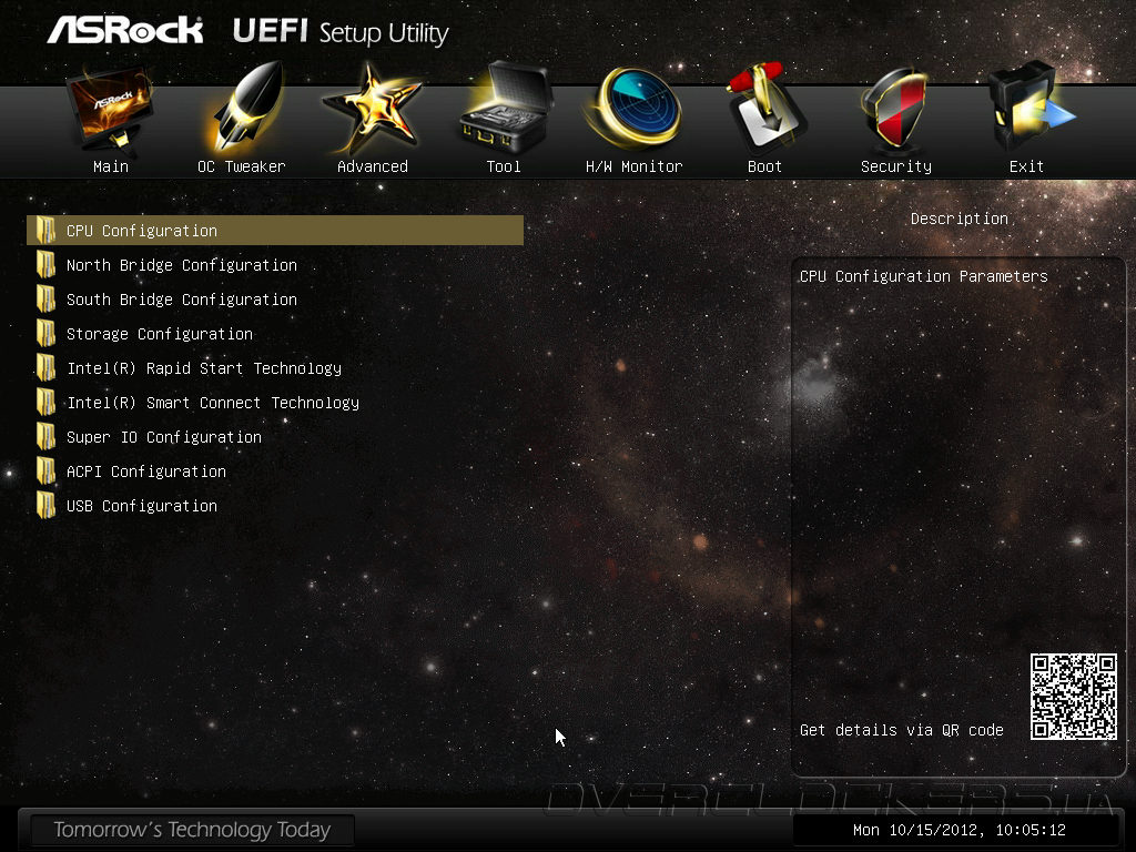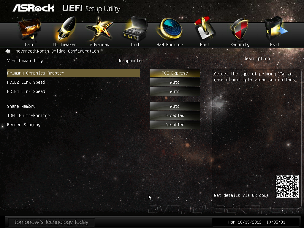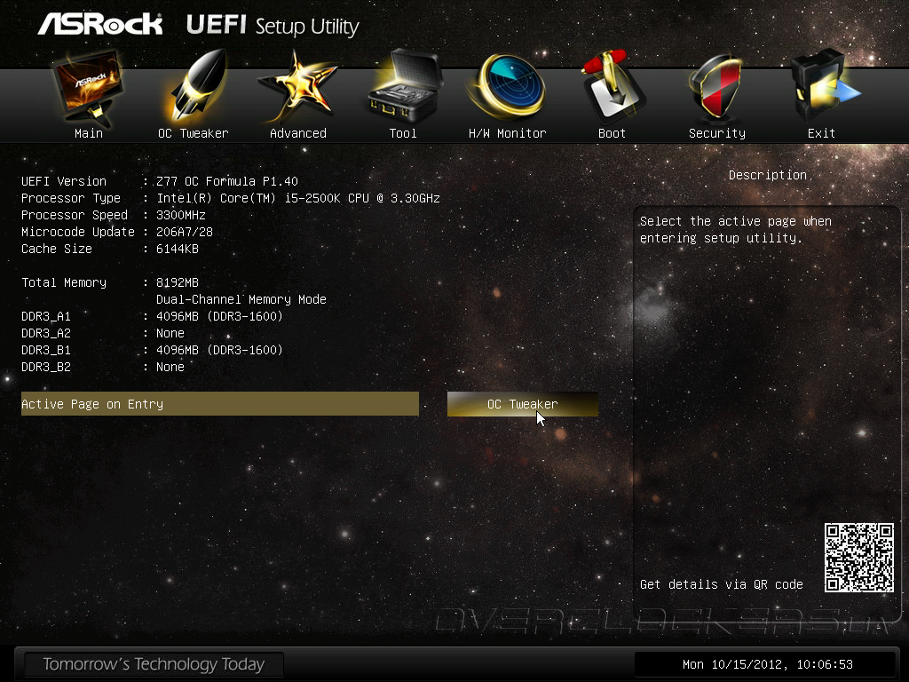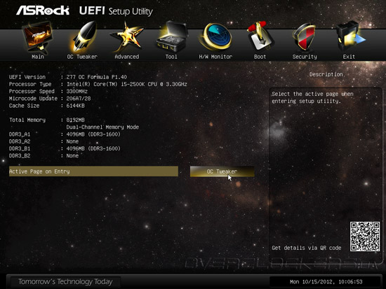 В качестве прошивки системная плата Z77 OC Formula использует Unified EFI разработки AMI, впрочем, от стандартной утилиты настройки APTIO не осталось и следа, программисты ASRock полностью переработали интерфейс и снабдили управляющий микрокод новинки массой дополнительных возможностей. Для входа в меню настройки следует использовать клавишу Del или F2, после чего пользователям открывается раздел OC Tweaker, где сосредоточены все основные параметры разгона и управления быстродействием. UEFI системной платы имеет режим LN2 Mode, предназначенный для эксплуатации систем криогенного охлаждения, но при использовании обычных воздушных систем охлаждения данную опцию лучше оставить в значении Disabled.