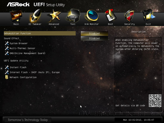 Следующий раздел меню настройки — Tools, в котором пользователю предлагается ряд полезных утилит и дополнительных опций. Начнем с функции Dehumidifier, работа которой заключается в периодическом включении процессорного вентилятора для предотвращения образования конденсата внутри выключенного системного блока. Следующая опция — Sound Effect — включает звуковые эффекты интерфейса UEFI, и, на наш взгляд, не представляет никакой практической ценности.
