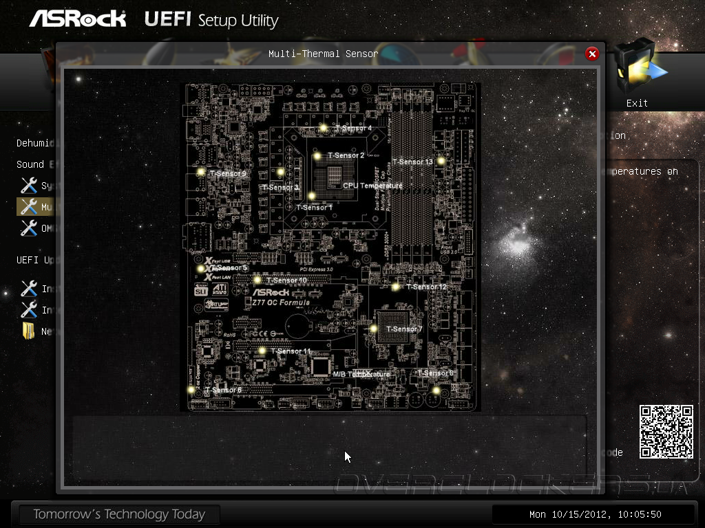 Неожиданно в разделе Tools мы обнаружили функцию, относящуюся к аппаратному мониторингу. Микропрограмма Multi-Thermal Sensor выводит показания 15 температурных датчиков, установленных на поверхности системной платы. Ценность этой функции в том, что она не только показывает значения, но и отображает место расположения датчика.