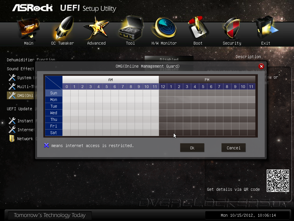 Традиционно для современных системных плат ASRock прошивка Z77 OC Formula имеет встроенное средство управления доступом к локальной сети OMG (Online Management Guard). C её помощью можно запретить использование сетевого подключения строго по расписанию.