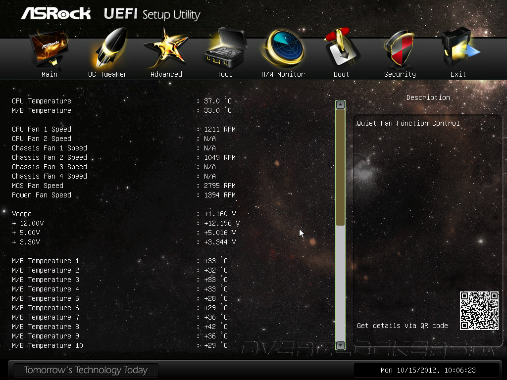В части аппаратного мониторинга возможности Z77 OC Formula достаточно обширны. В разделе прошивки H/W Monitoring выводятся температуры центрального процессора и материнской платы, скорости вращения всех восьми вентиляторов, а также напряжения питания на вычислительных ядрах и шинах +3,3 В, +5 В. +12 В. Здесь же можно найти показания температурных 13 температурных датчиков, однако, более наглядную информацию можно получить при помощи встроенной в прошивку утилиты Multi-Thermal Sensor.