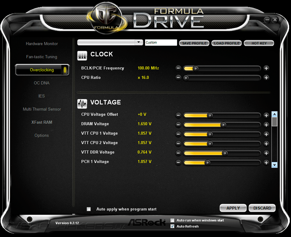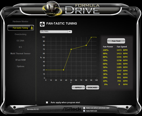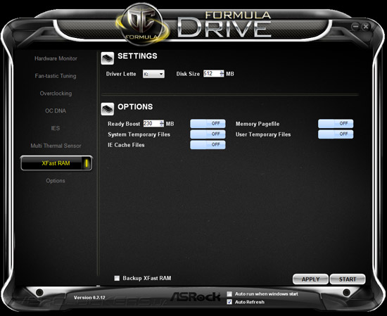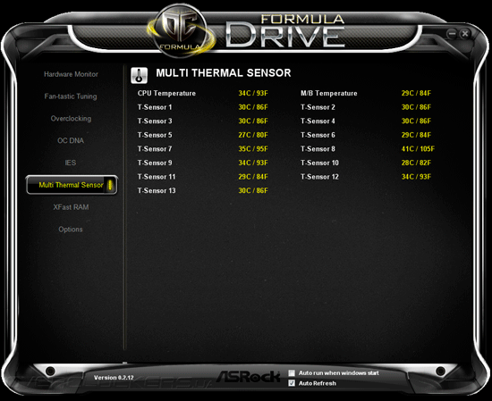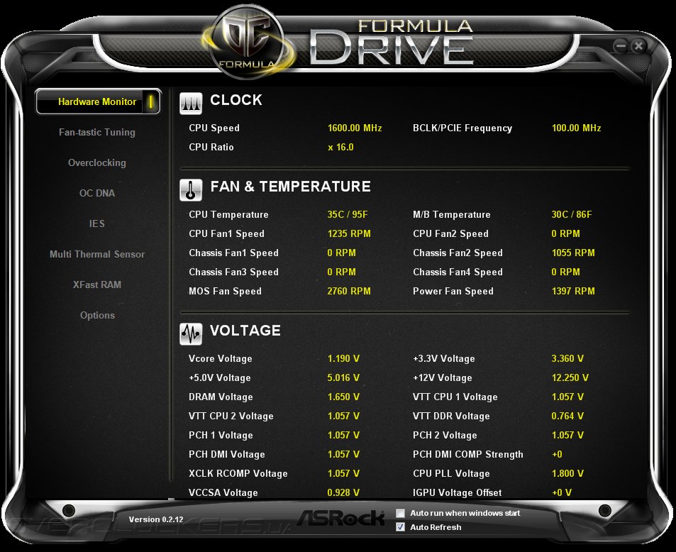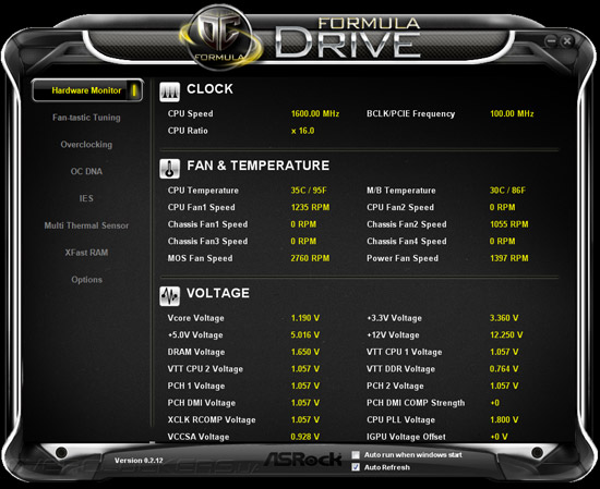 Программное обеспечение, предлагаемое покупателям вместе с Z77 OC Formula, несколько отличается от стандартного набора программ, поставляемого вместе с обычными системными платами ASRock. Место Extreme Tuning Utility заняла программа Formula Drive, обладающая полным спектром функций по разгону, системному мониторингу материнской платы, а также управления некоторыми фирменными технологиями. В главном окне утилиты отображаются показания системного мониторинга, среди которой текущие параметры быстродействия центрального процессора, данные о скоростях вращения восьми вентиляторов и значения напряжений в 16 контрольных точках на всех основных компонентах материнской платы.