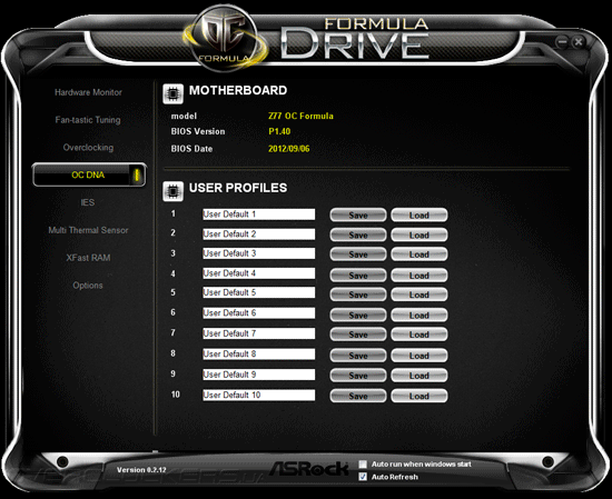 Программа Formula Drive позволяет сохранить до десяти профилей пользовательских настроек в окне OC DNA, а функция IES (Intelligent Energy Saver) активирует фирменную технологию энергосбережения и отображает текущее количество активных фаз преобразователя напряжения центрального процессора.