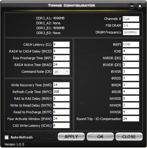 В целом, утилита Formula Drive предлагает достойную функциональность, но, все же, не хватает возможности управления параметрами ОЗУ и дополнительными функциями цифровой подсистемы электропитания Digi Power. Мы надеемся, что в скором будущем соответствующие опции появятся. Отметим, что проблема управления таймингами подсистемы оперативной памяти решена уже сейчас при помощи отдельной утилиты Timing Configurator. Её интерфейс прост и понятен и, в целом, типичен для программ подобного назначения.