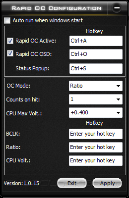 При помощи Rapid OC пользователи могут управлять базовой частотой, множителем или напряжением на центральном процессоре, причем, программа позволяет задать шаг изменения выбранного параметра, а всплывающее OSD меню отобразит новые настройки разгона. Использование данной функции оправдано в условиях открытого стенда при достижении максимального уровня разгона