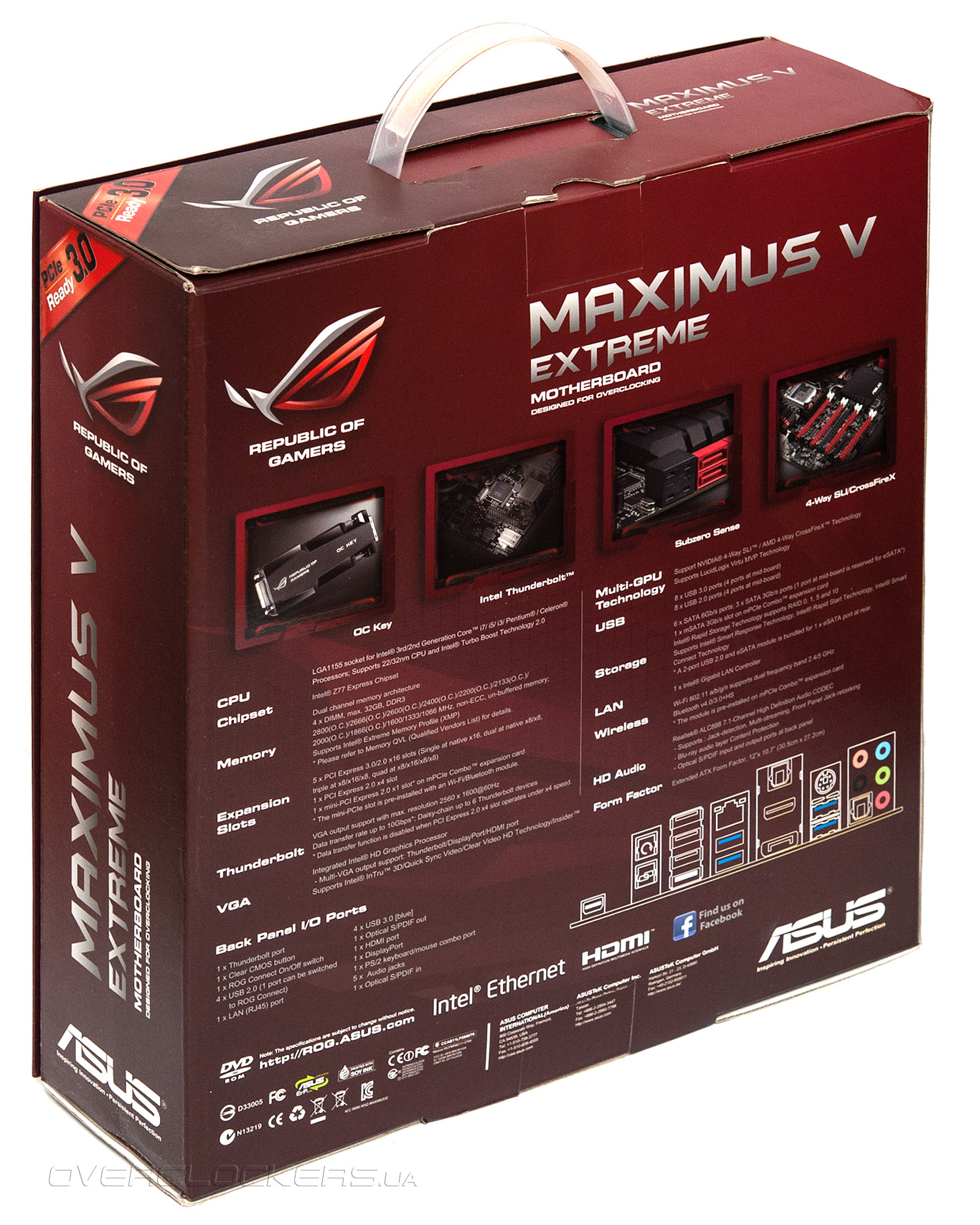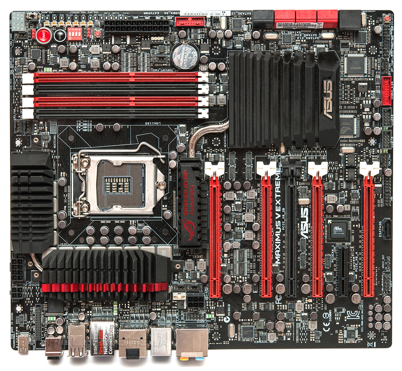 Материнская плата ASUS Maximus V Extreme отличается широчайшей функциональностью. Компоновка элементов на плате очень плотная, но, тем не менее, уместить такое количество опций в форм-фактор ATX не удалось. Плата имеет размеры 305х272 мм, что соответствует стандарту E-ATX.