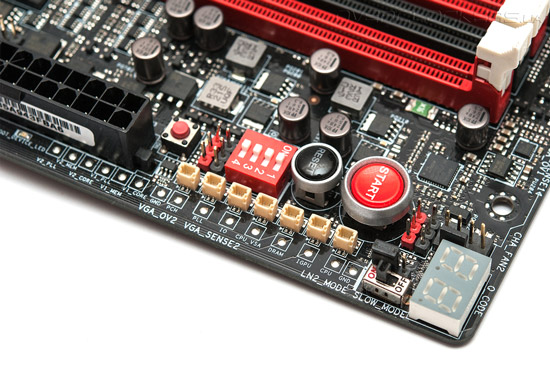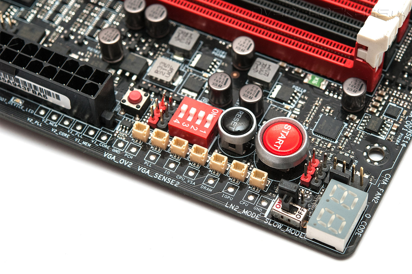 Помимо мощной подсистемы питания энтузиасты оценят неплохой набор органов управления и контроля Maximus V Extreme. Практически все они сосредоточены возле слотов DIMM, в правом верхнем углу. Это кнопки включения и перезагрузки системы, POST-индикатор и контактная площадка ProbeIt для снятия показания всех ключевых напряжений, к которой, к тому же, через переходники можно «жестко» подключить щупы мультиметра. Там же находится кнопка Go_button, отвечающая за функцию старта системы с проблемными модулями или разгона в среде ОС по предустановленному профилю. Есть еще пара наборов колодок VGA Hotwire, позволяющие через UEFI управлять напряжением подключенных видеоадаптеров. Отметим также наличие DIP-переключателя, предназначенного для отключения слотов PCI-E x16, тумблера Slow Mode, благодаря которому можно загрузить систему на пониженных частотах, и джампера LN2, отвечающего за снижение стандартных порогов для срабатывания защит coldbug и coldboot.