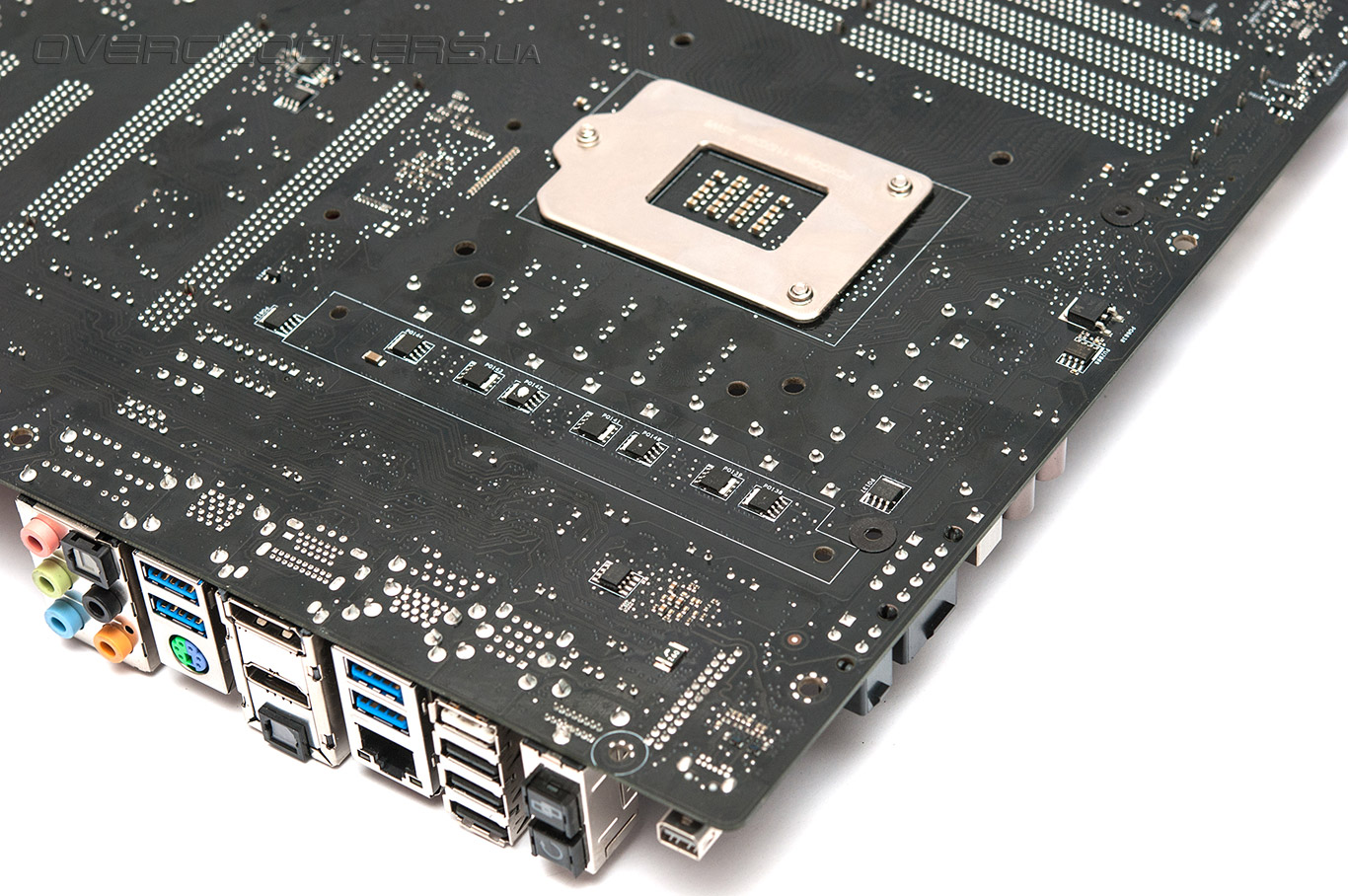 Часть силовых элементов расположена с тыльной стороны материнской платы. За их охлаждение отвечает теплораспределительная пластина.