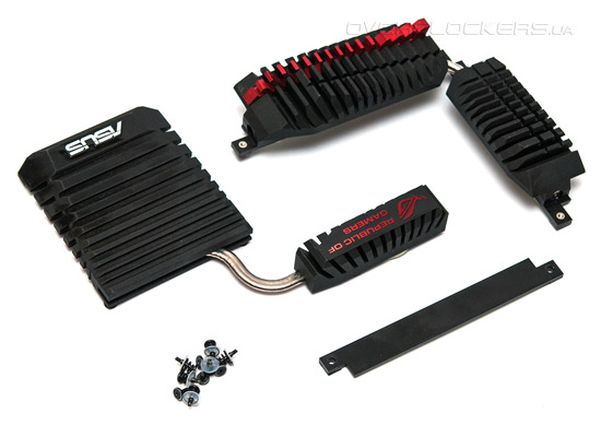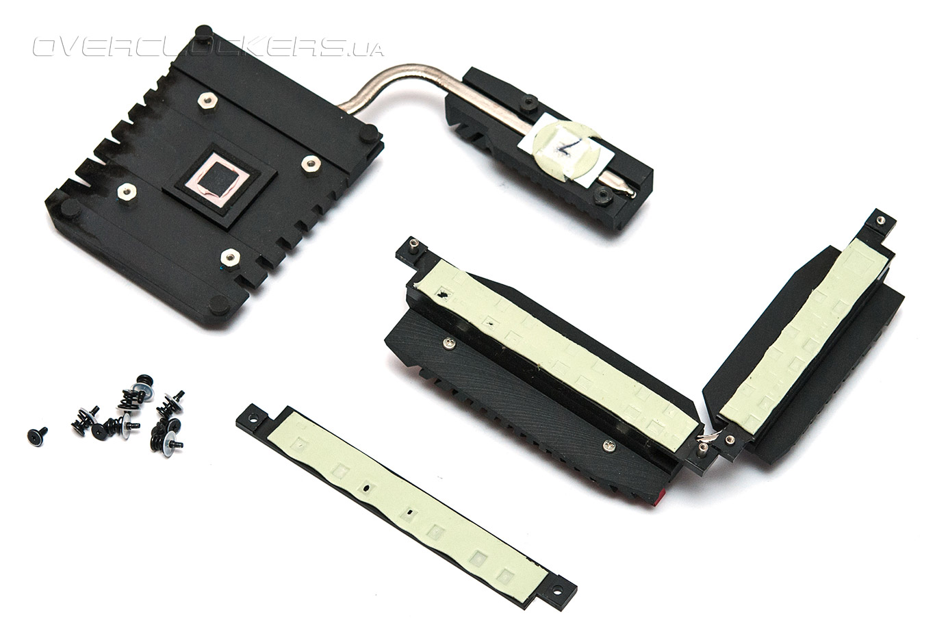 Система охлаждения у платы довольно простая. Пара алюминиевых радиаторов микросхемы PCH и чипа PLX, отвечающего за коммутацию линий PCI Express, соединены между собой тепловой трубкой и крепятся шестью винтами. Точно так же соединены два радиатора элементов питания и держатся при помощи четырёх винтов. Снятие системы охлаждения не вызывает затруднений.