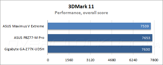 Тестирование бенчмарком Futuremark 3DMark 11 дает представление о производительности материнских плат в современных 3D-играх, использующих API DirectX 11 и активно использующих расчеты физики. Мы используем профиль Performance, который уменьшает влияние видеокарты на общий балл.