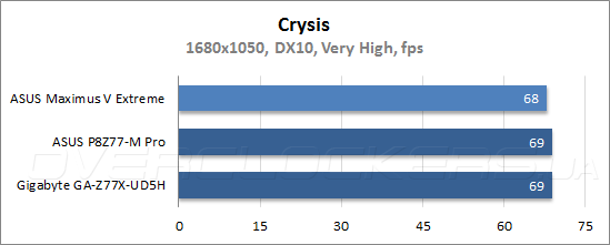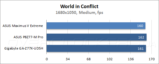 ASUS Maximus V Extreme стабильно проигрывает 1—2 кадра в каждой игре. При 150-ти fps пара кадров не играет большой роли. Тем не менее, очевидно, что использование высокоскоростного коммутатора PLX дает о себе знать при использовании одной видеокарты. Похожую картину мы наблюдали при тестировании Gigabyte G1.Sniper 3. Обе эти топовые платы дают возможность установить до четырех видеоадаптеров, чем не могут похвастать продукты для LGA1155, не оснащенные чипом PLX. Поэтому 1—2% отставания новинке можно простить.