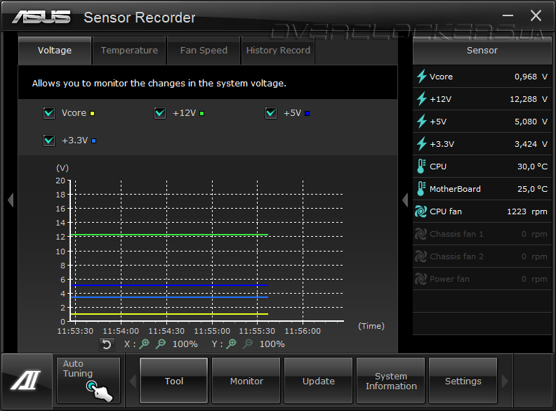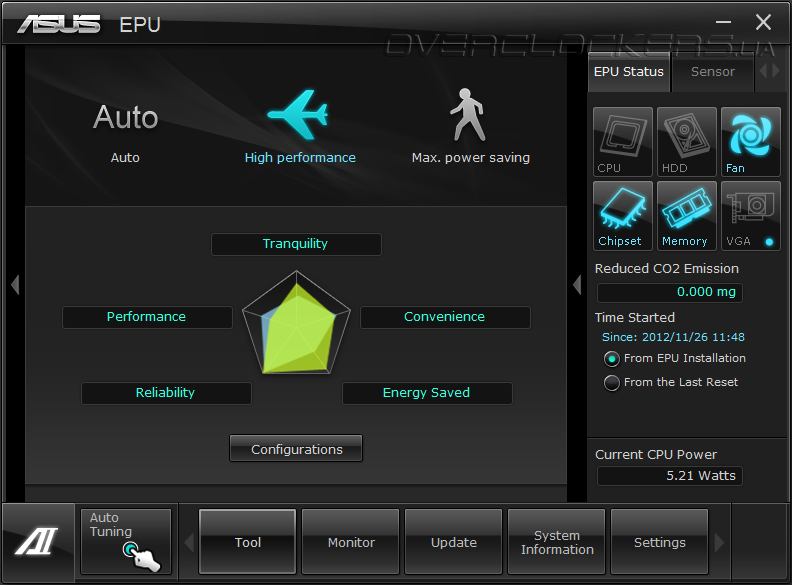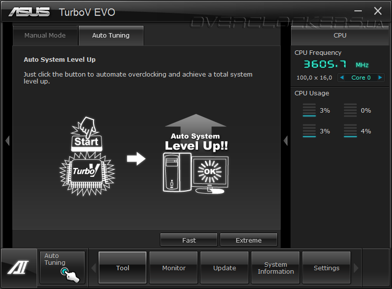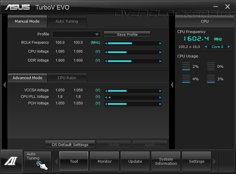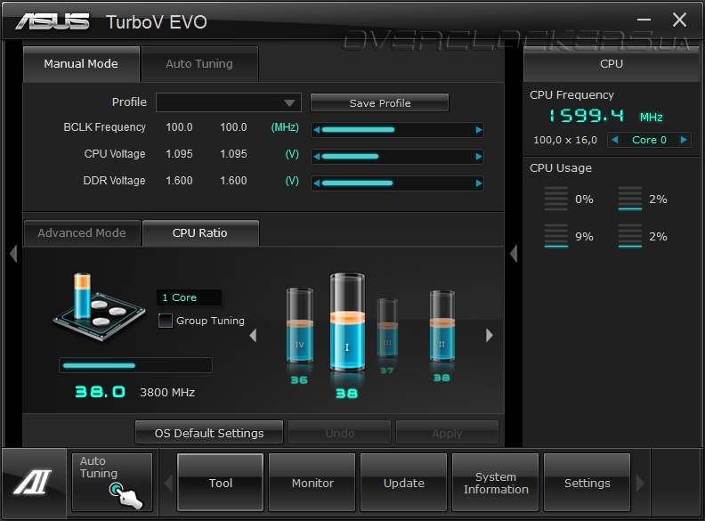 Остальные программы предназначены для обновления микрокода платы, изменения заставки при старте системы, получения информации о системе и настройки самого комплекса Ai Suite II. Разгон