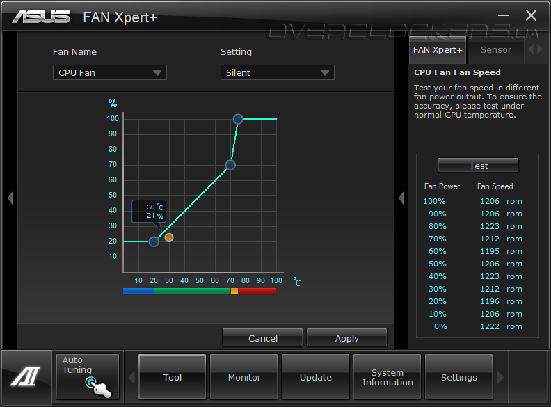 Выбрать режим энергосбережения можно в EPU, тогда как FAN Xpert+ позволяет настроить скорость вращения вентиляторов, при этом мониторинг осуществляется с помощью Probe II.